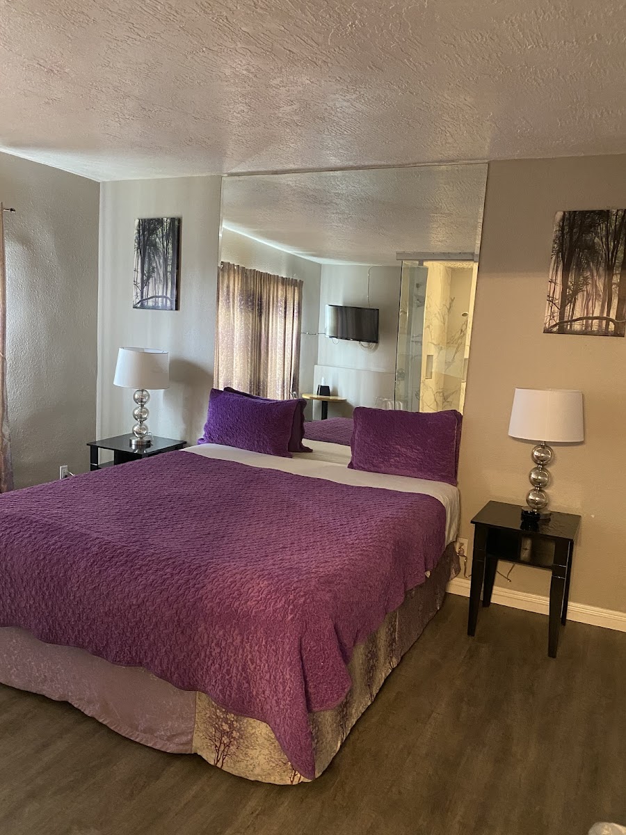 Mirrors on the walls and their is always a room . You can get a few hours for 50 bucks. Each room is different and kind of unique . Love the mirrors and the showers are cool in some of the rooms . Good location .ac blows cold no breakfast no coffee ample parking not too noisy .